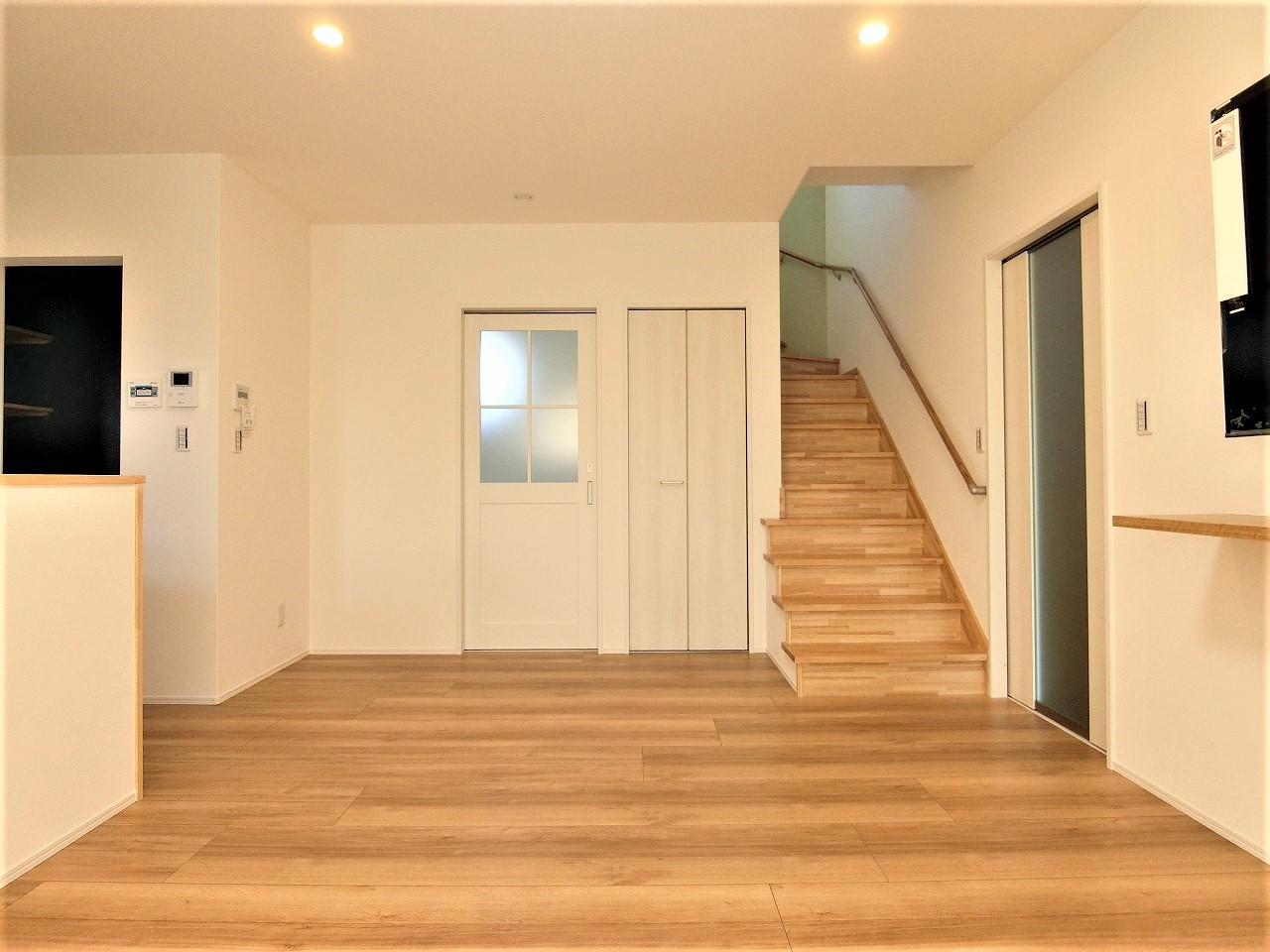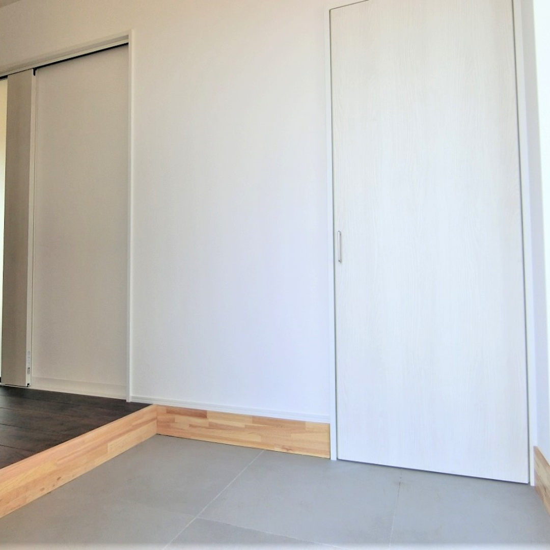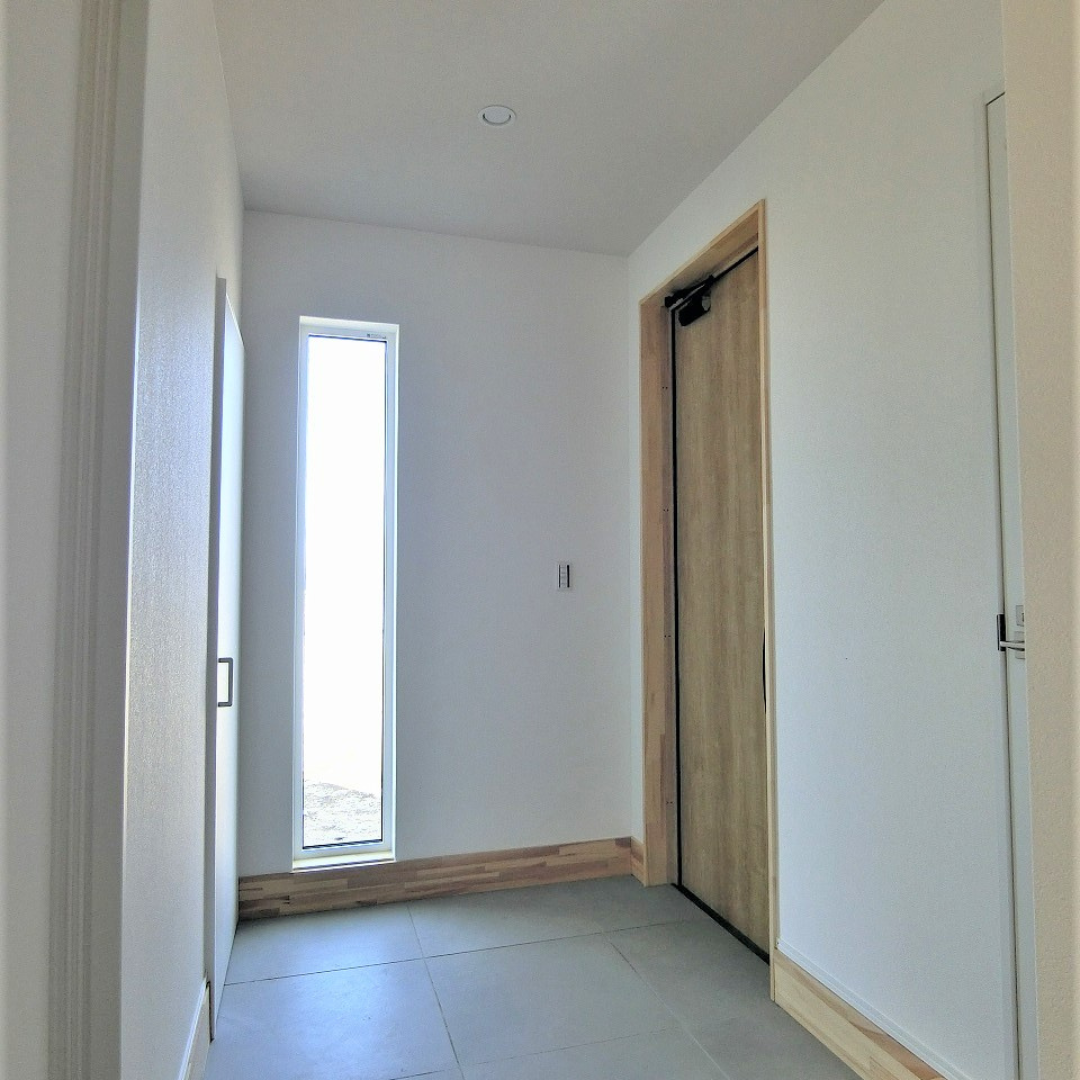 - 玄関:右に映っている引戸が土間収納。壁と一体化しています。