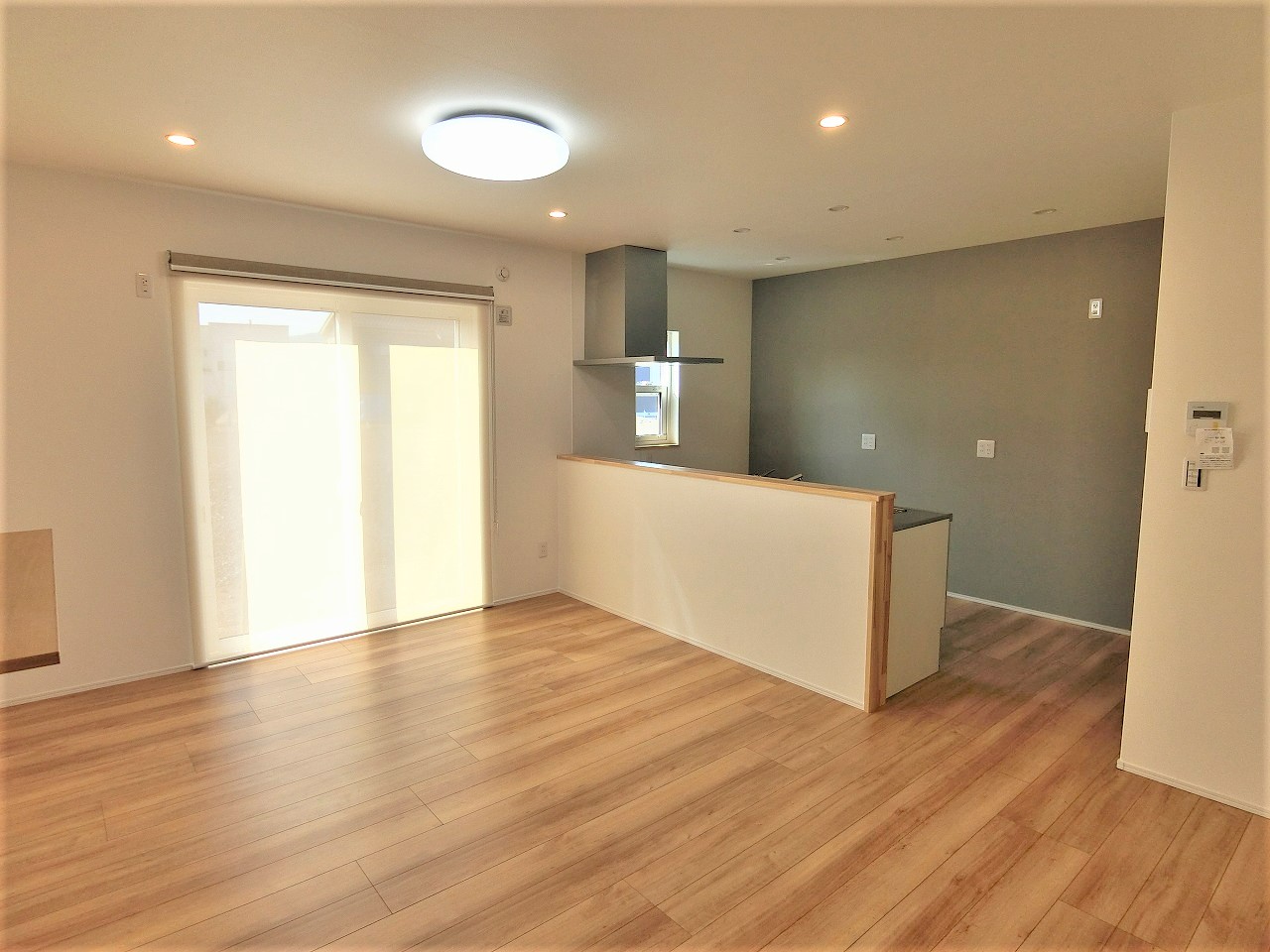 - 1階LDK:片側だけ壁付けのペニンシュラキッチン。腰壁で手元が見えないようになってます。
