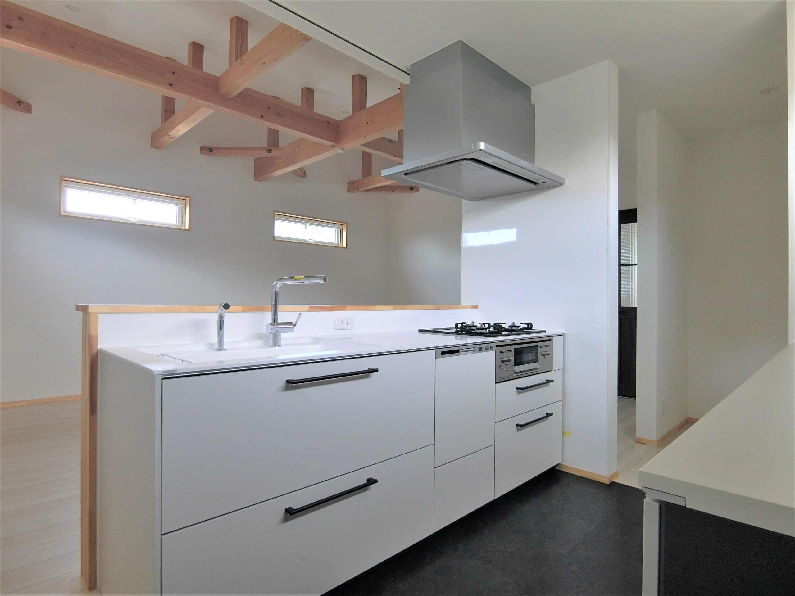 | ⑪2F_キッチン | アイランド風のペニンシュラキッチン。キッチンをぐるっと回れて動線を確保。 |
