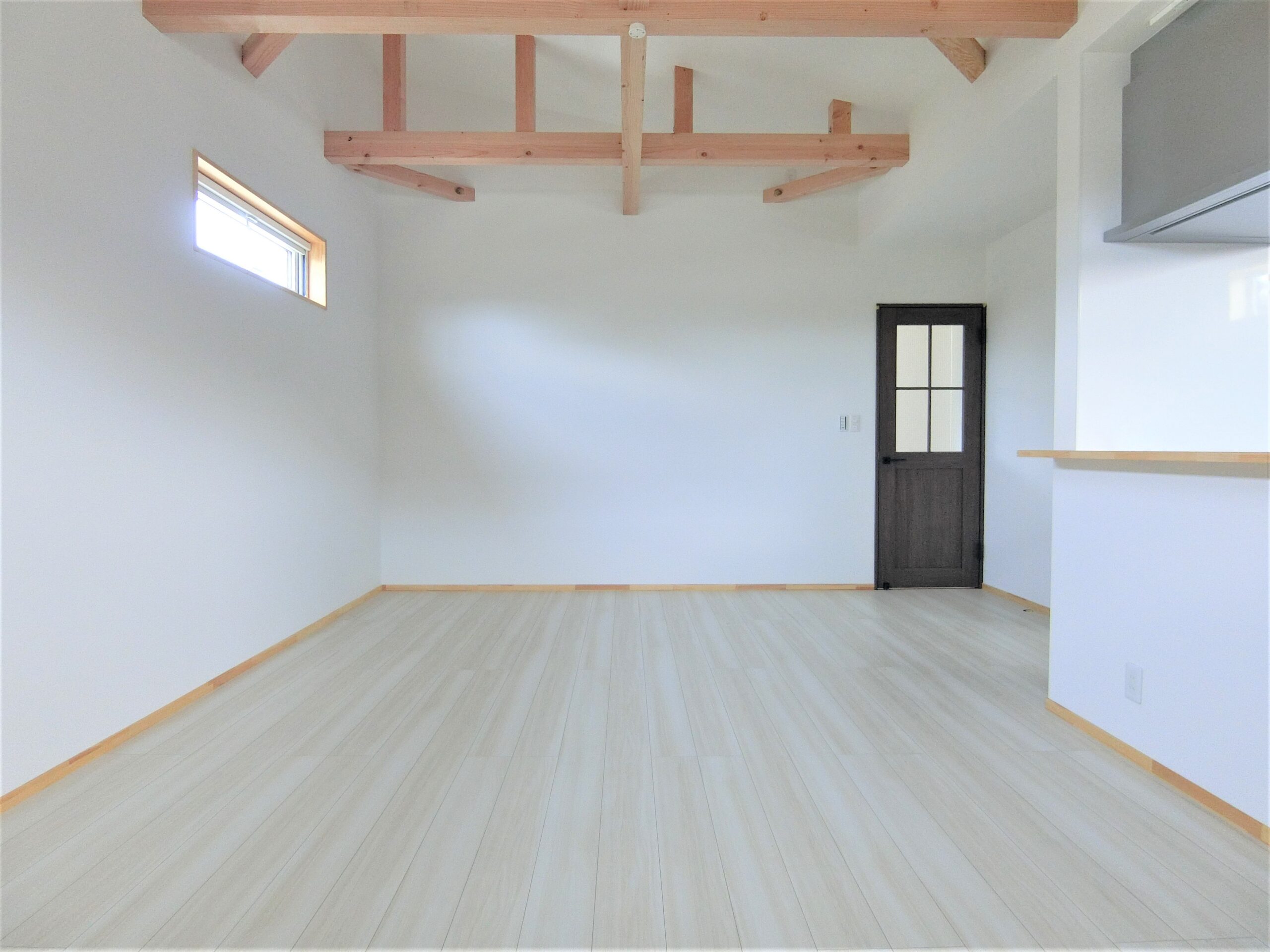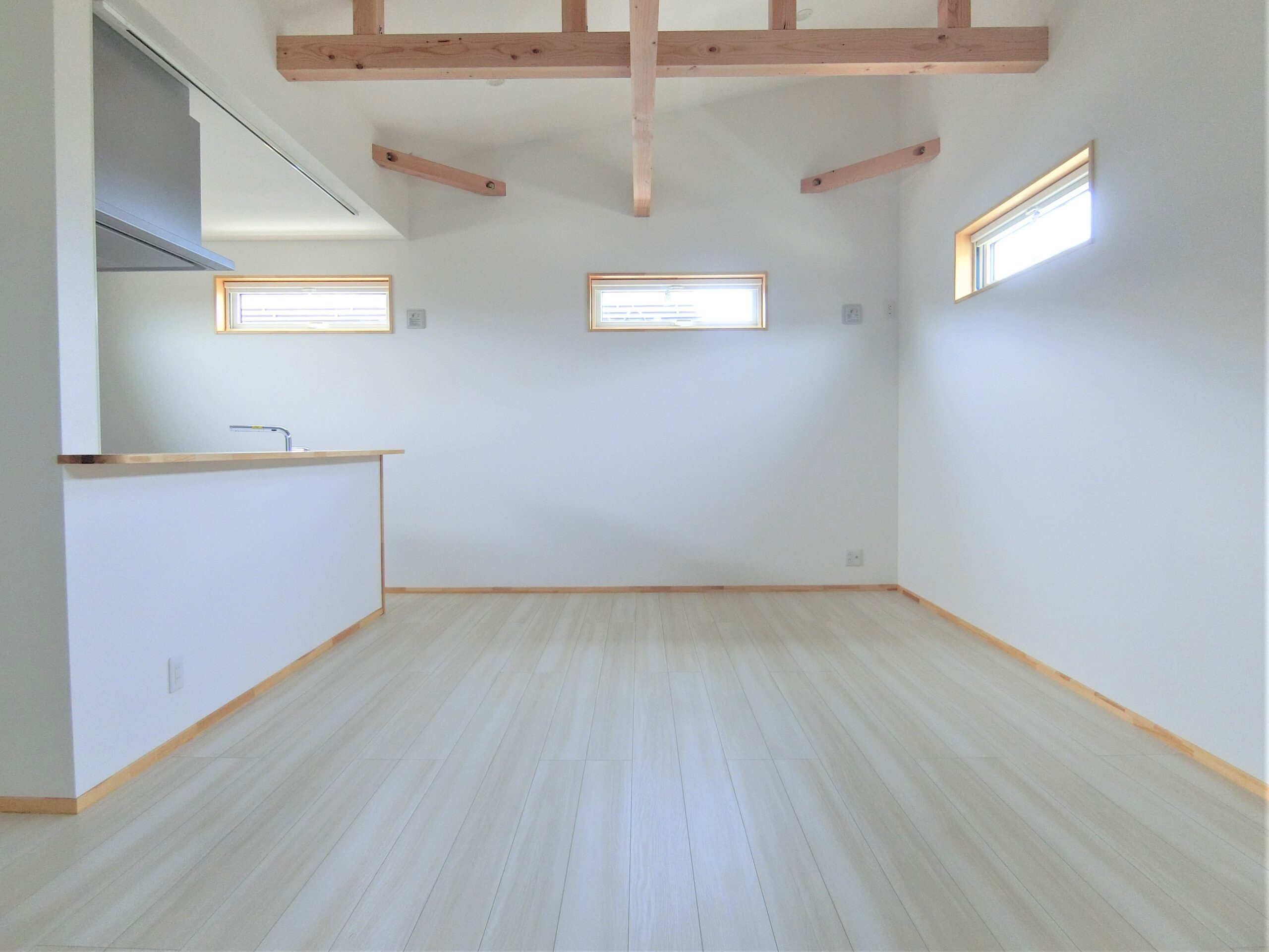 | ①LDK | 2階にして内装を明るい色味でまとめたので窓の小ささの割に照明なしでも明るく感じます。 |