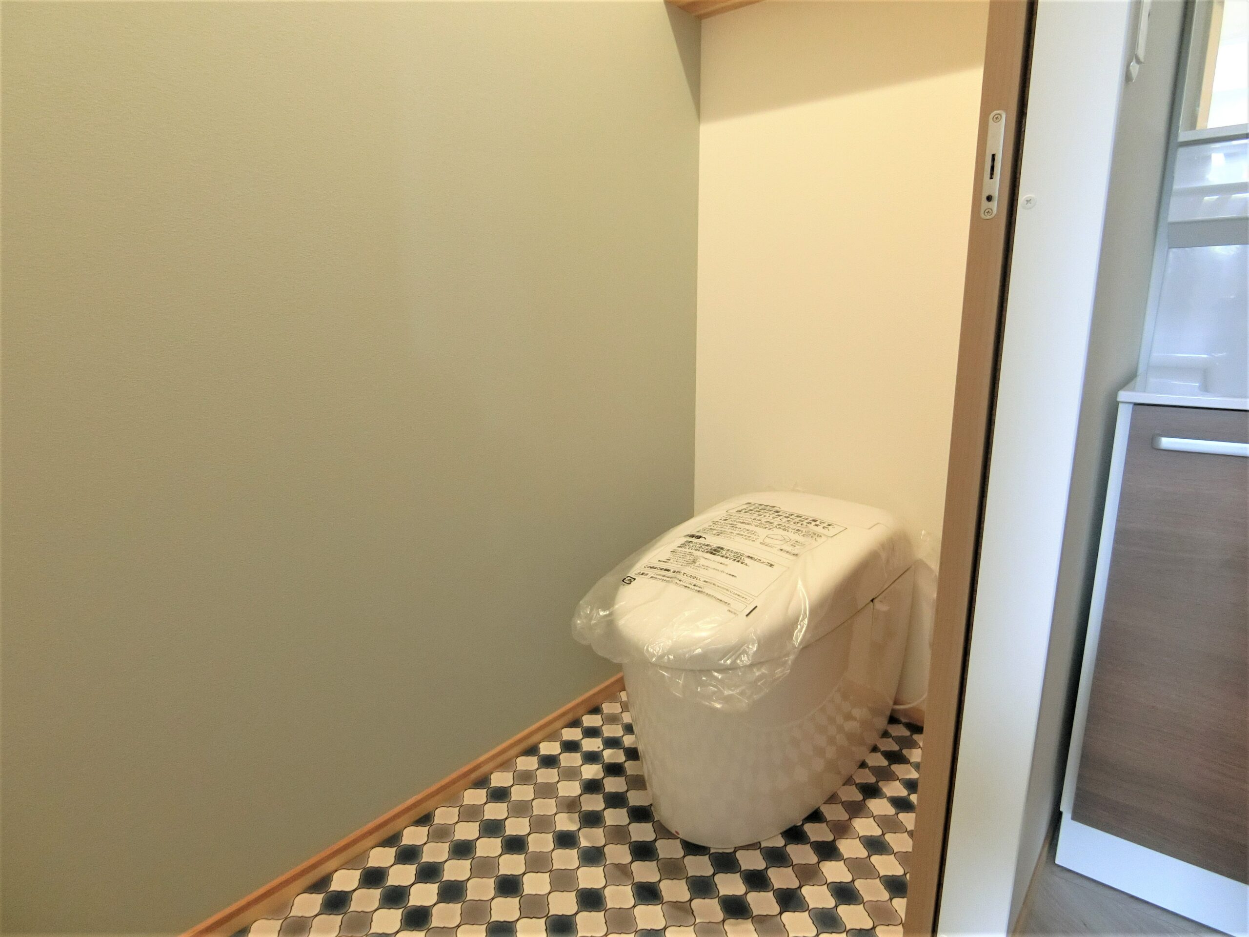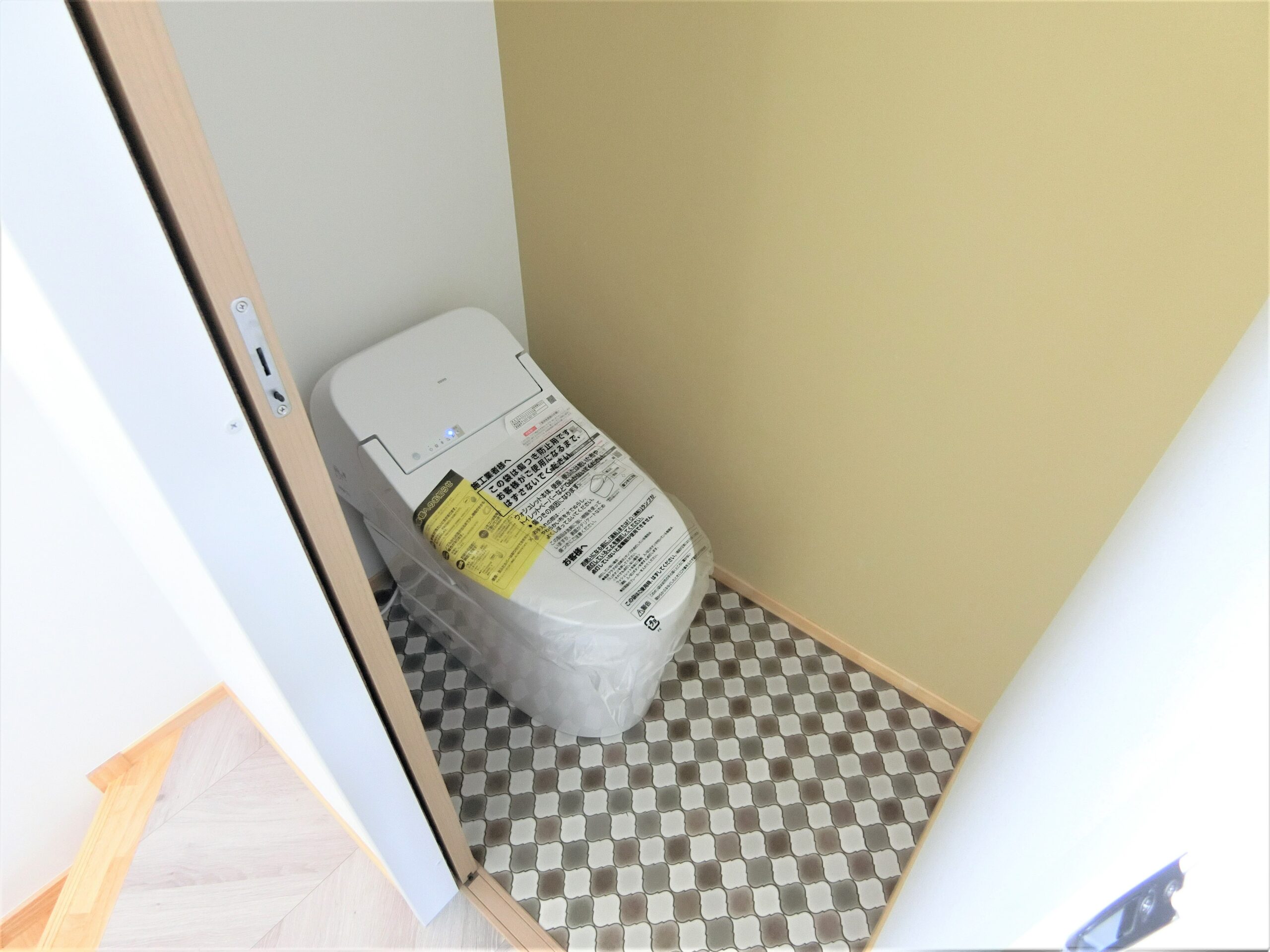 | ⑤1F_トイレ | 床はお掃除しやすいビニール系床材。トイレや洗面は面積が狭いこともあって個性的なデザインを取り入れやすいスペース。 |