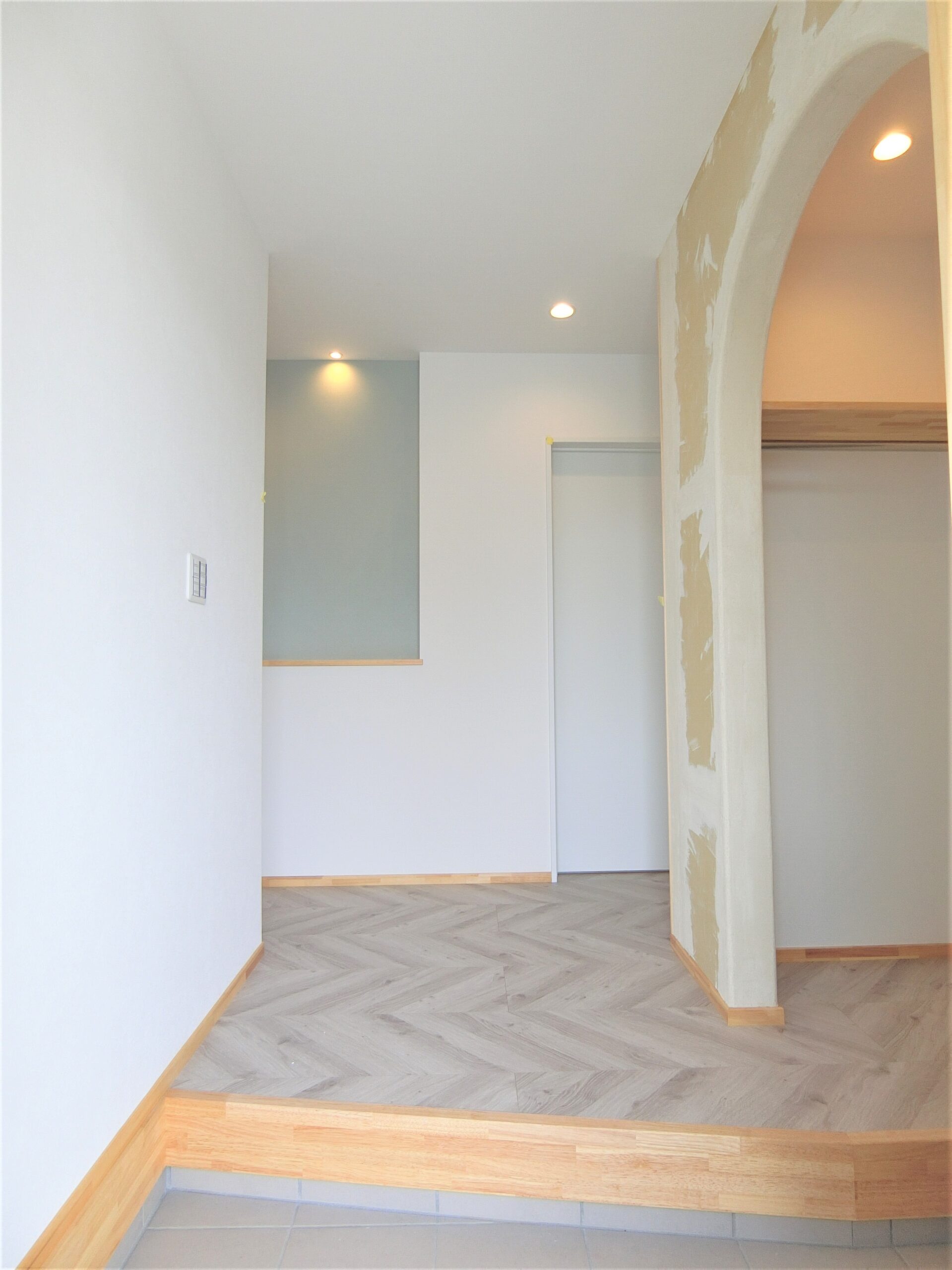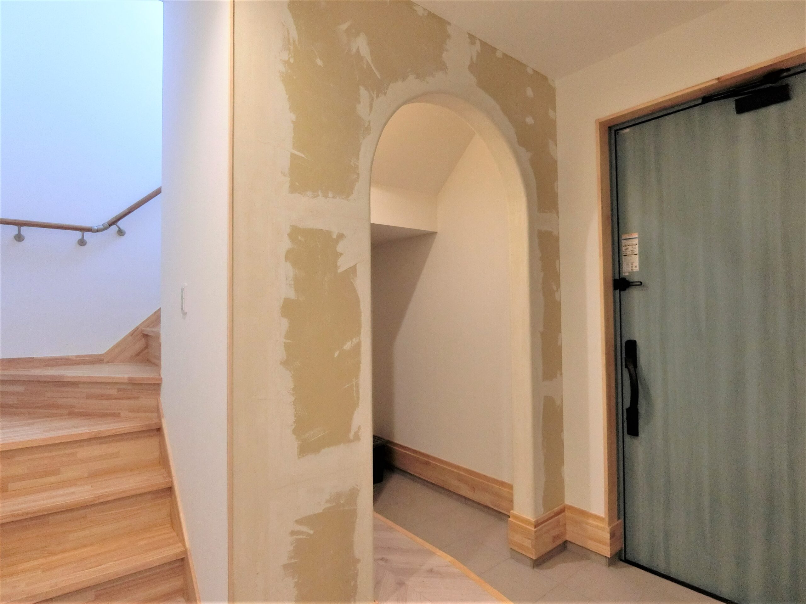 | ⑬1F_玄関 | シューズインはアーチ形状。これから施主様一家で塗ります!どんな感じに仕上がるのか楽しみです。 |