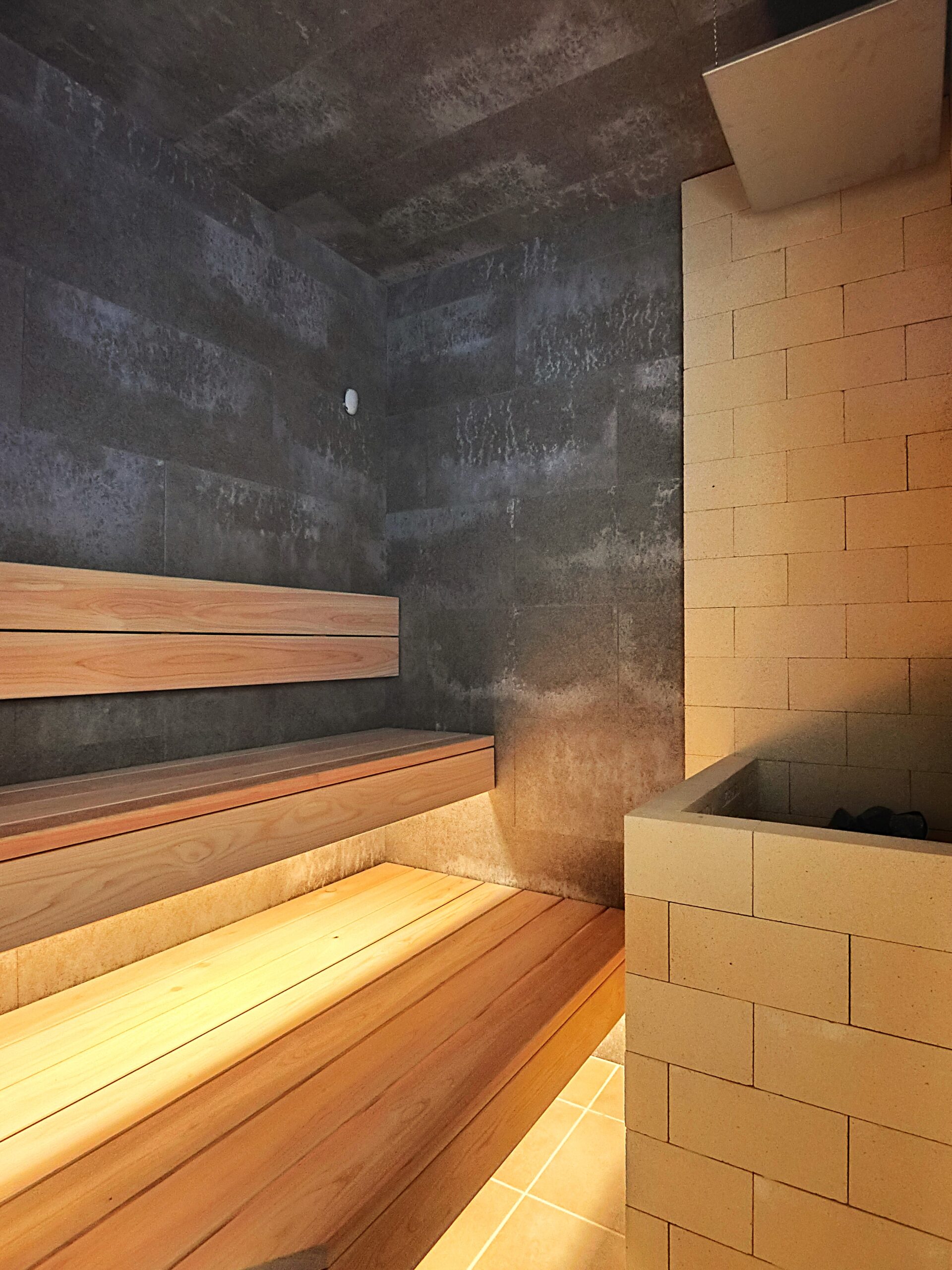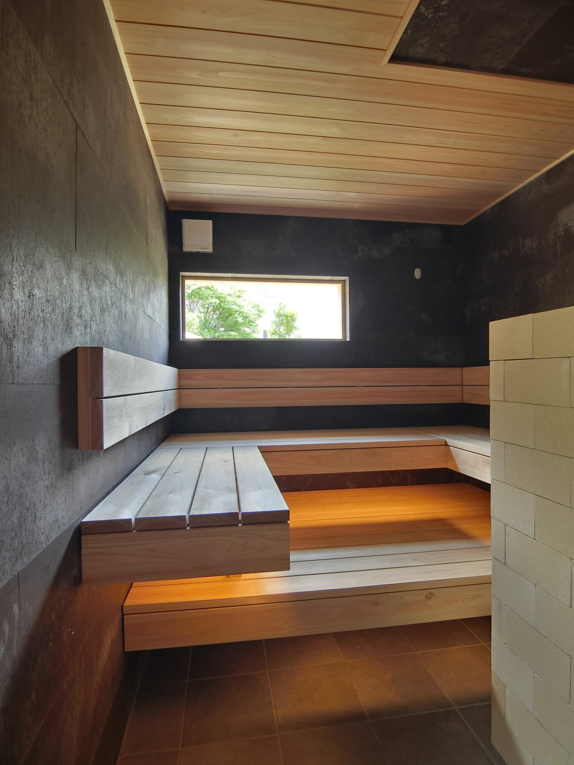 - ジュニアスイートルーム_サウナ_セルフロウリュ可能。ベンチはサイズに合わせて自社大工が製作。