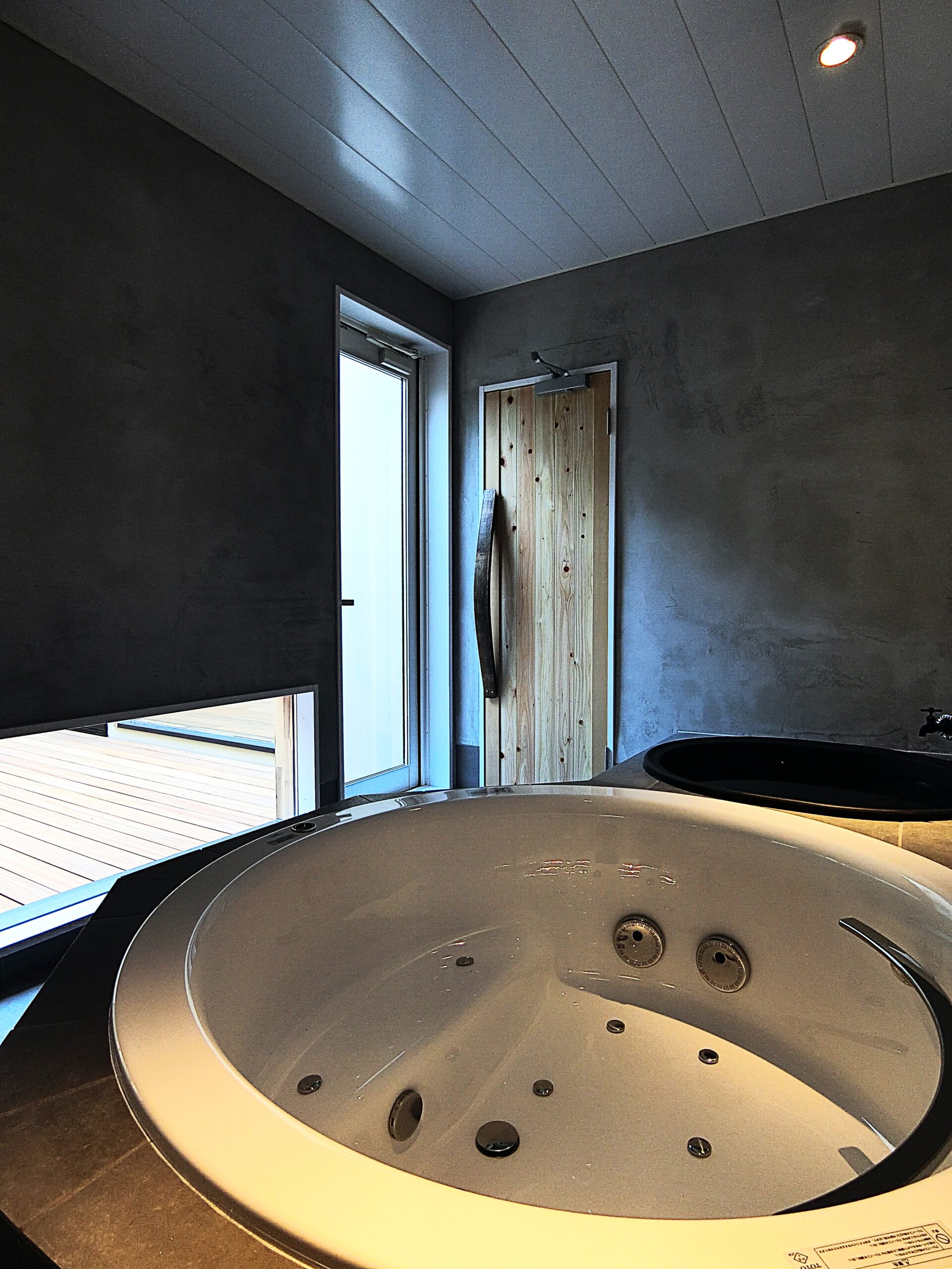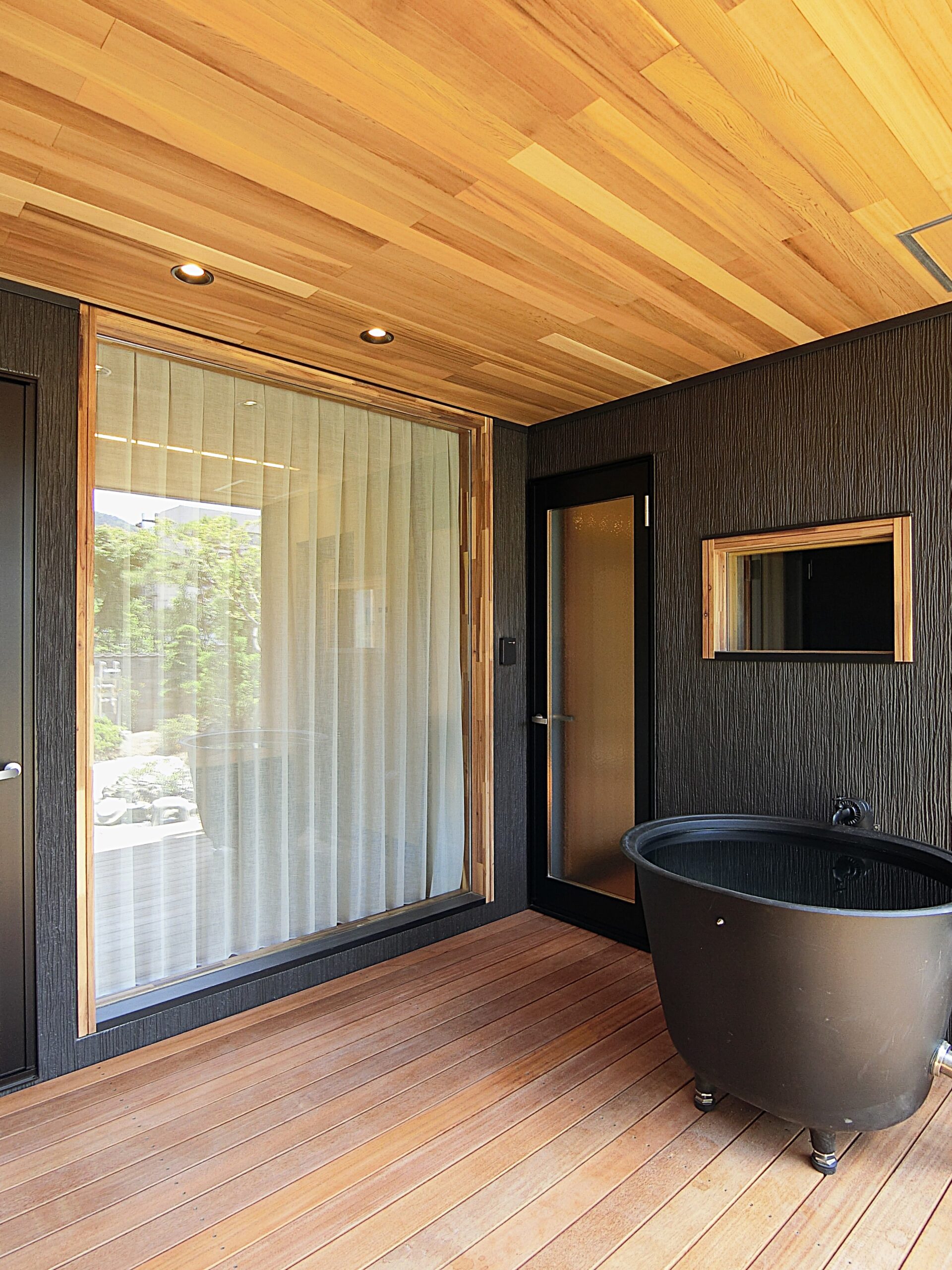 - ジュニアスイートルーム_水風呂_五右衛門風呂を使用。チラー装置で夏でも冷水で整います。サッシは造作で大きな窓を作りました。
