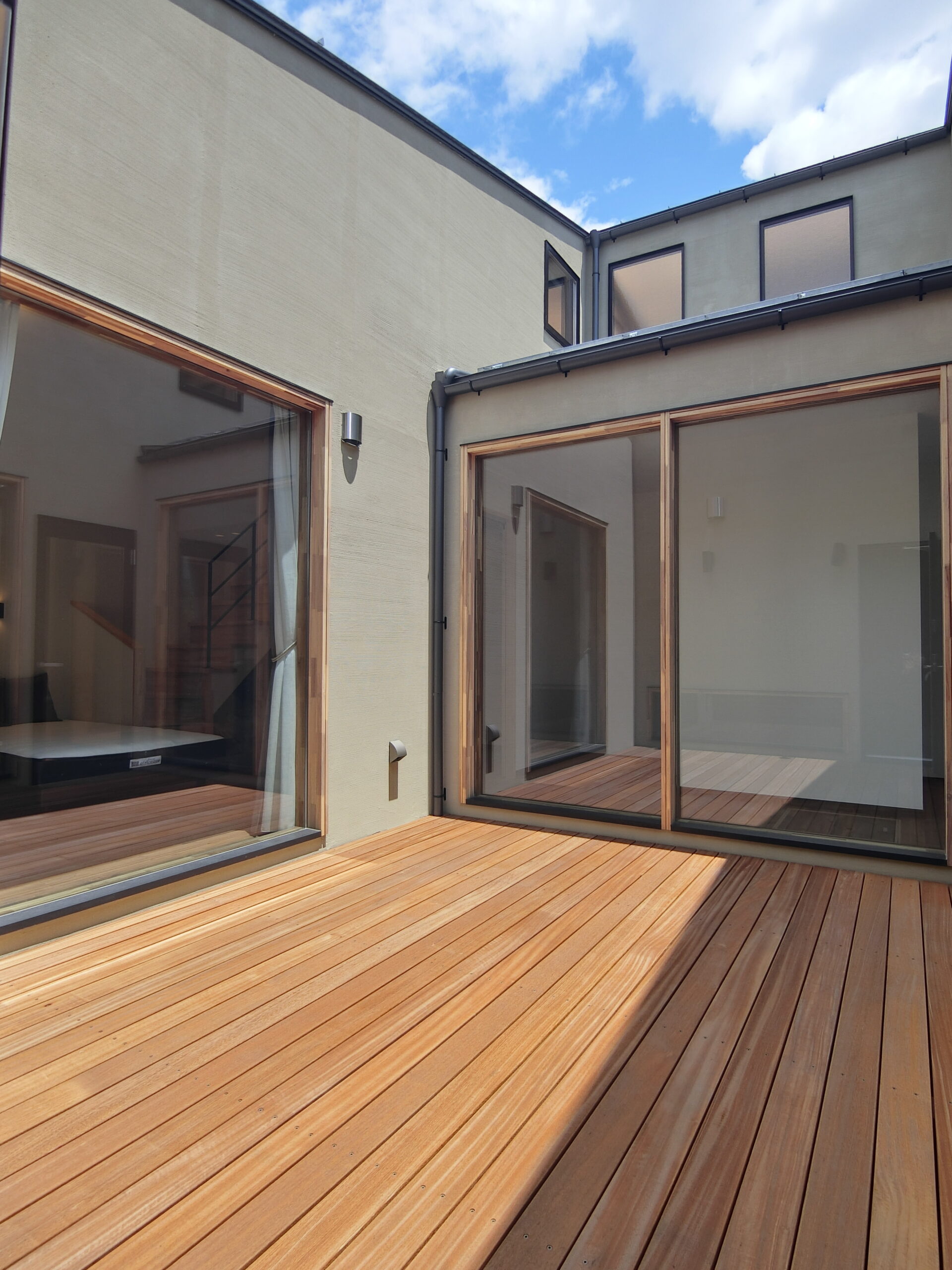- スイートルーム_外気浴_開放的な窓サッシ、ウッドデッキは自社製作。