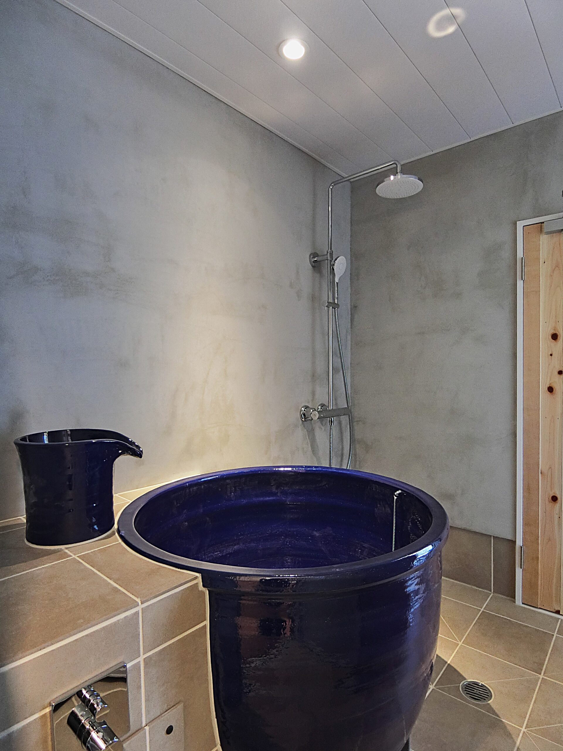 - ジュニアスイートルーム_浴室_信楽焼浴槽、タイル張りの浴室。奥に見えるサウナドアも造作です。