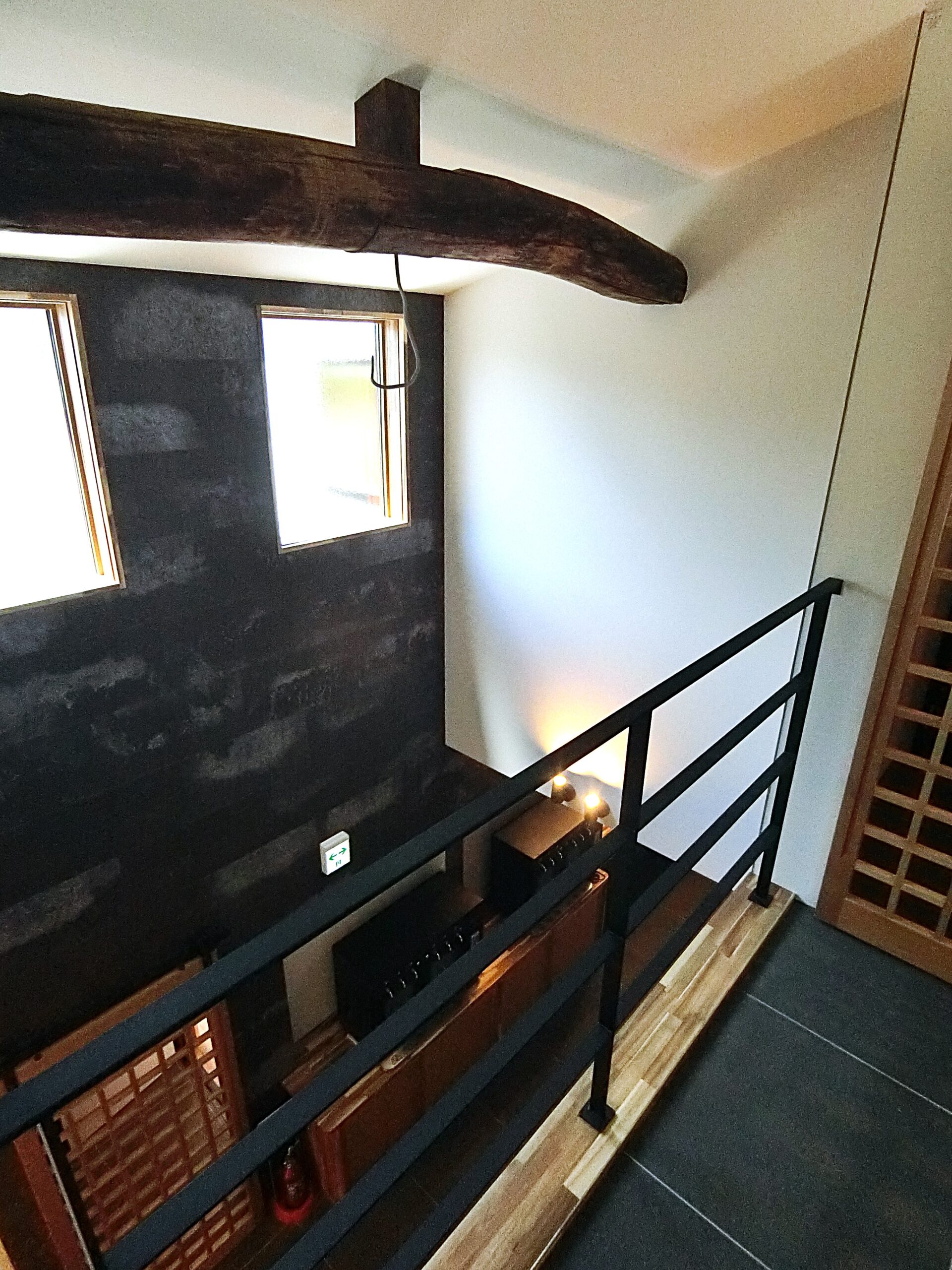 - 吹抜け_以前あった古家の梁を再利用。施主こだわり!外にも使用した外壁材をホールにも採用して繋がり感を持たせています。
